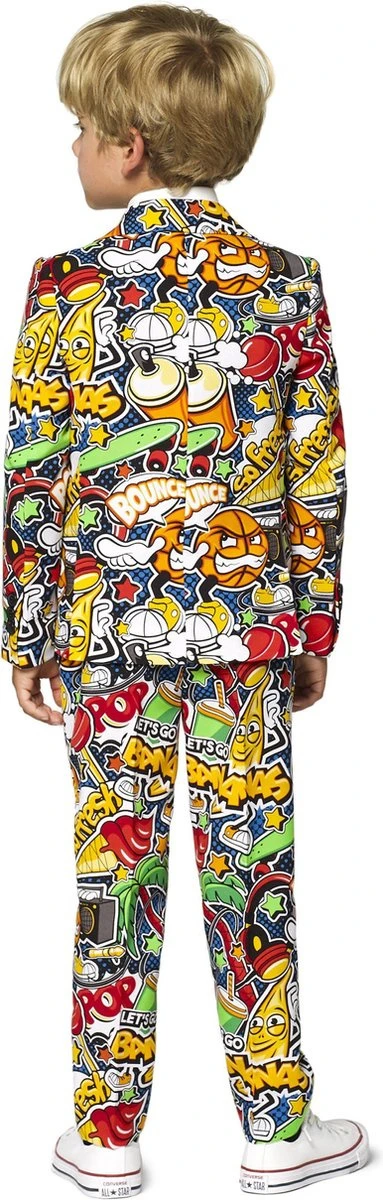 Heb je je weleens afgevraagd wat er omgaat in het hoofd van een kind? Als je een kind vraagt om het te visualiseren, ziet het er ongeveer uit zoals deze print. Dit pak is geïnspireerd op het stadsleven en zorgt dat jouw kleine gentleman er fresh uitziet op de speelplaats en elke bijzondere gelegenheid. Alle ogen zullen op hem gericht zijn, want dit pak is de perfecte combi van stijlvol&cool.