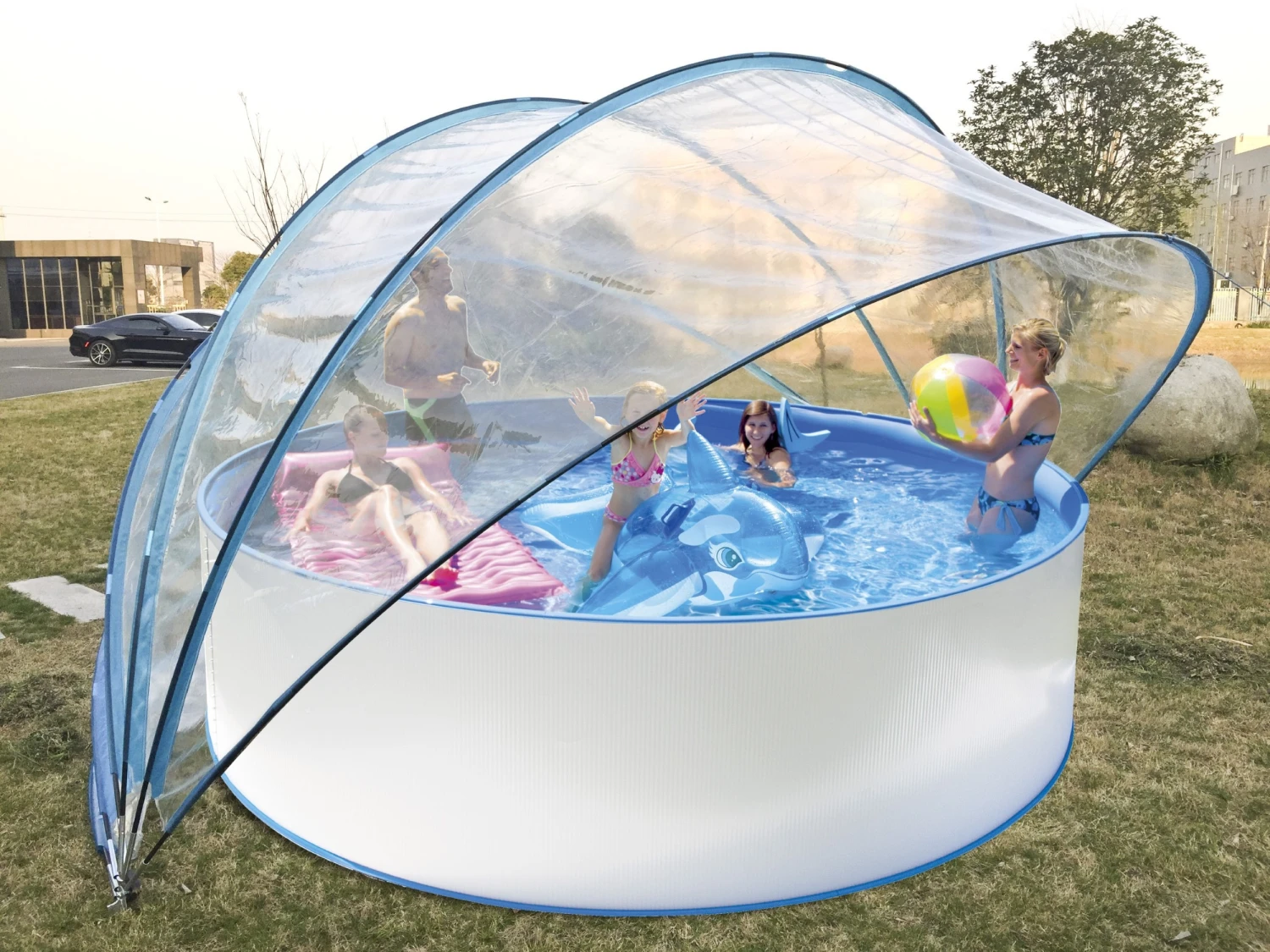 Zwembadoverkapping transparantf Blue Bay van 0,20/0,25 mm pvc met buizen van fiberglas. Hiermee wordt vervuiling door bladeren e.d. voorkomen en ook blijft het water beter op temperatuur. Ook werkt het als UV-bescherming (factor 50+). Gemakkelijk te openen of te sluiten. Voor ingebouwde zwembaden met een doorsnee van max. 400 cm en voor bovengrondse zwembaden afhankelijk van diepte.